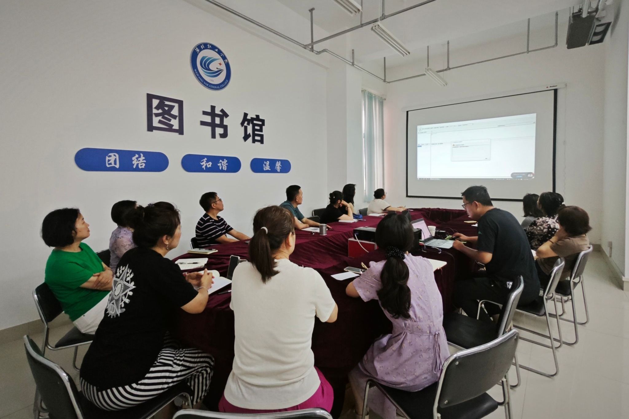2025-06-19为推进智慧图书馆的建设,增强业务素养,6月19日上午,特邀金盘集成管理系统的技术人员来我院图书馆进行业务培训,全体馆员参加。